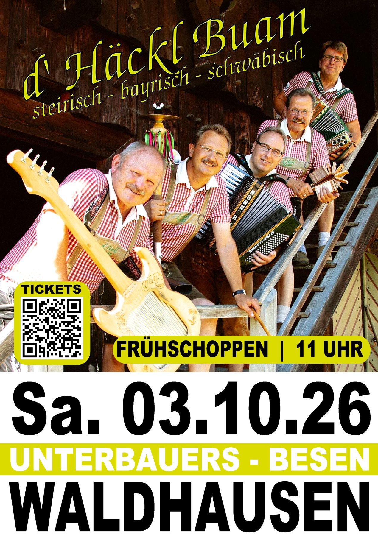 Am Samstag, 03.10.2026, heißt es ab 11 Uhr: beste Stimmung beim Frühschoppen mit den Häckl Buam in Unterbauers Besen.